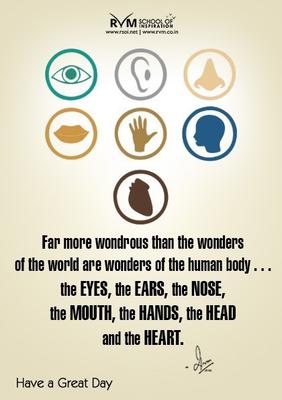 Far more wondrous than the wonders of the world are wonders of the human body . . . the Eyes, the Ears, the Nose, the Mouth, the Hands, the Head and the Heart. -RVM