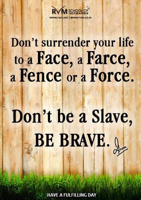 Don’t surrender your life to a Face, a Farce, a Fence or a Force. Don’t be a Slave, be Brave.