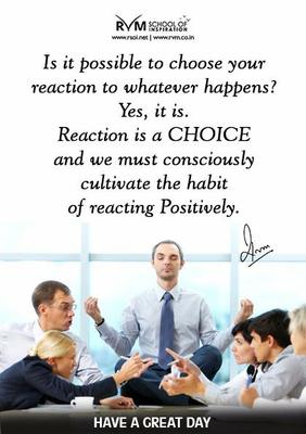 Is it possible to choose your reaction to whatever happens? Yes, it is. Reaction is a CHOICE and we must consciously cultivate the habit of reacting Positively.