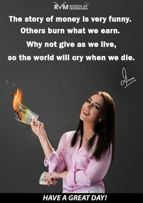 The story of money is very funny. Others burn what we earn. Why not give as we live, so the world will cry when we die.